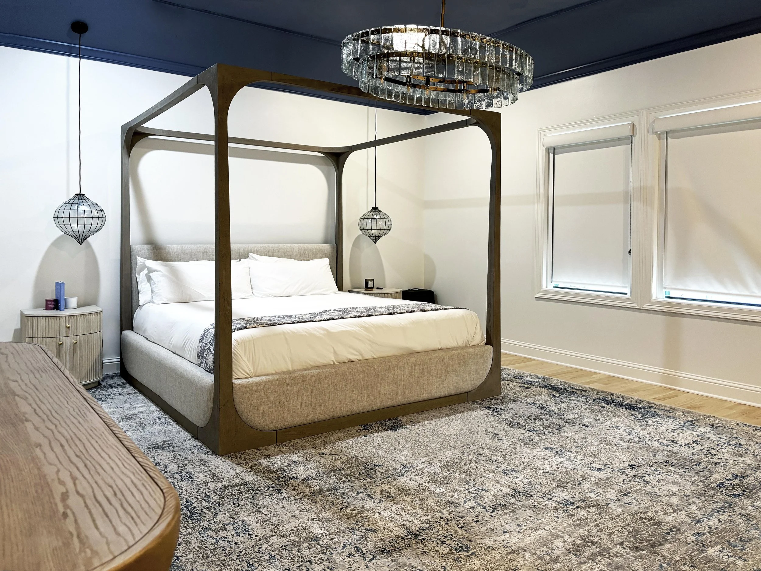 The Primary Bedroom's soothing ceiling color pulls the gentle blues in the deliciously soft rug, and allows the other pieces in the room to create serenity with a neutral palette. The canopy bed is a piece-de-resistance in this oversized space.