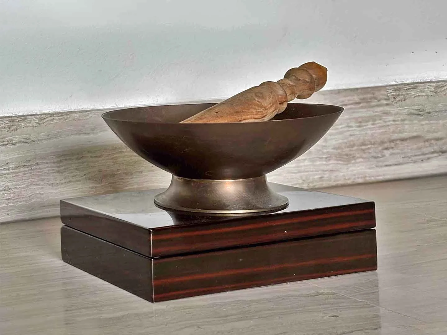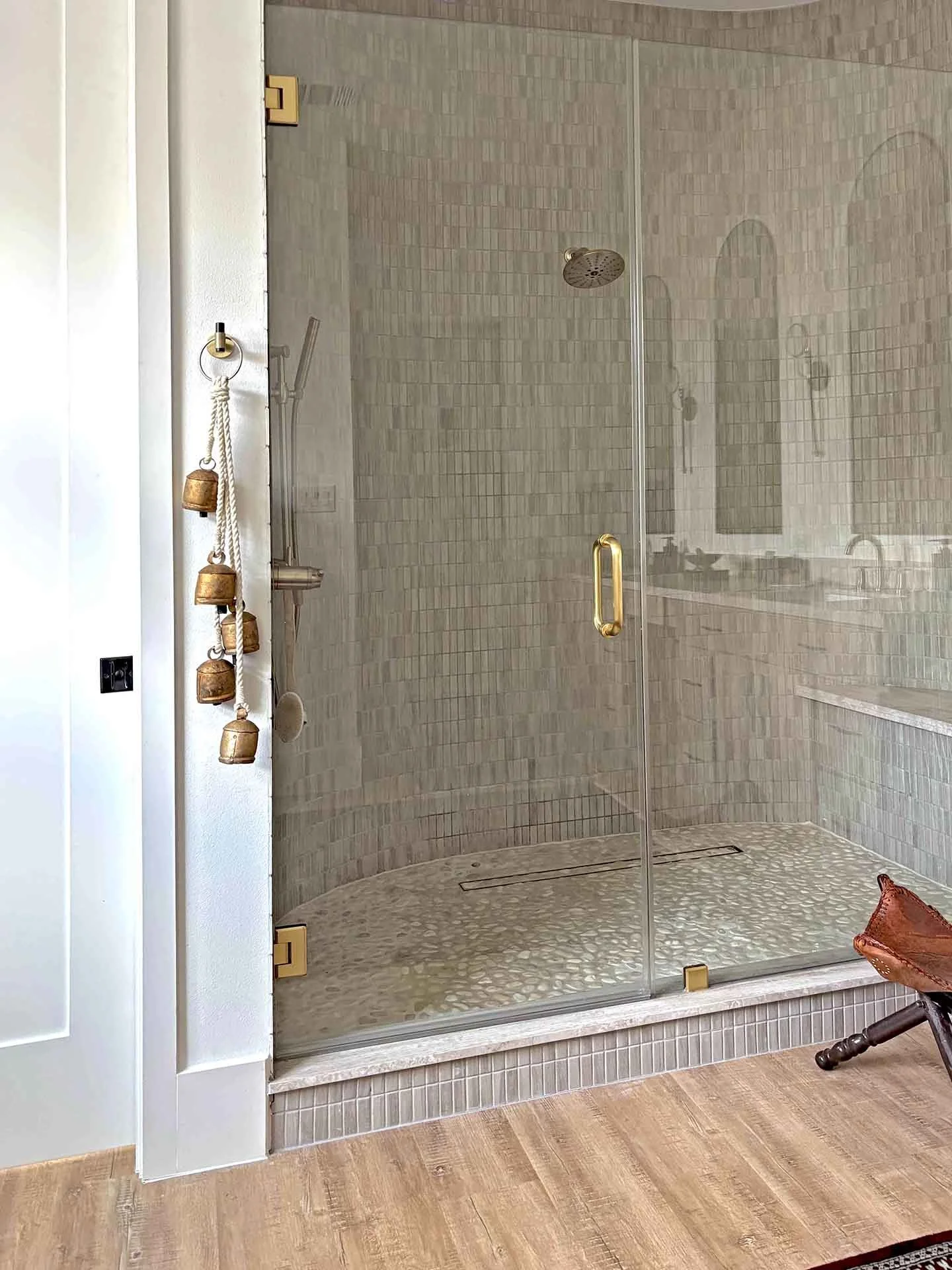 So we wove in history and heritage: antique front doors, a custom tile ‘rug’, an 18th century apothecary cabinet island, a salvaged wood mantel, antique brass corbels, unique tile layouts. The curved shower is reminiscent of Phuket and Bali. The walnut shelf is from a previous home. The brass backsplash feels like a favorite whisky bar. From mixed metals to wallpaper, the oversized lighting to the uncommon stones, every design decision is a considered one. And every space tells a story.