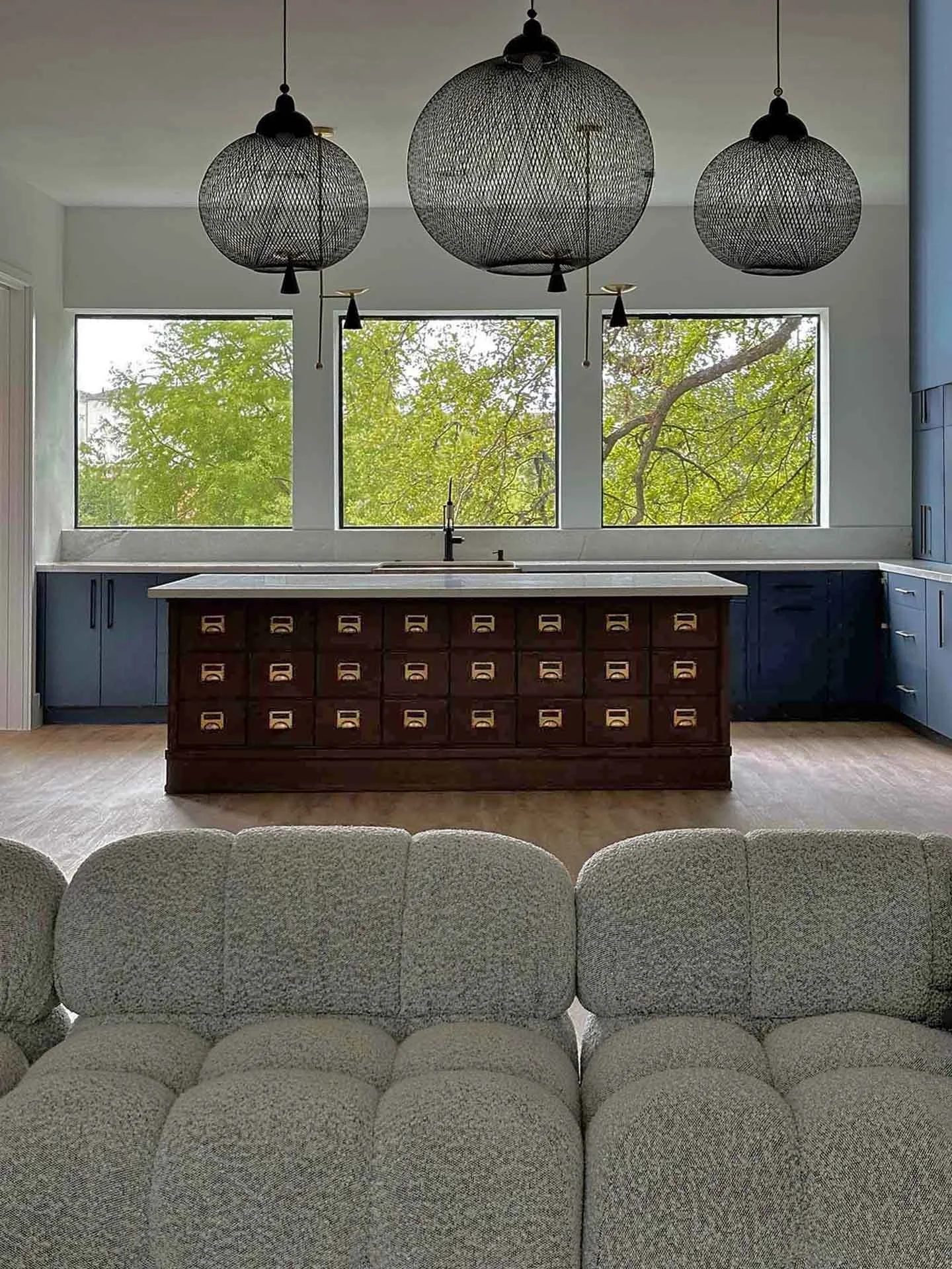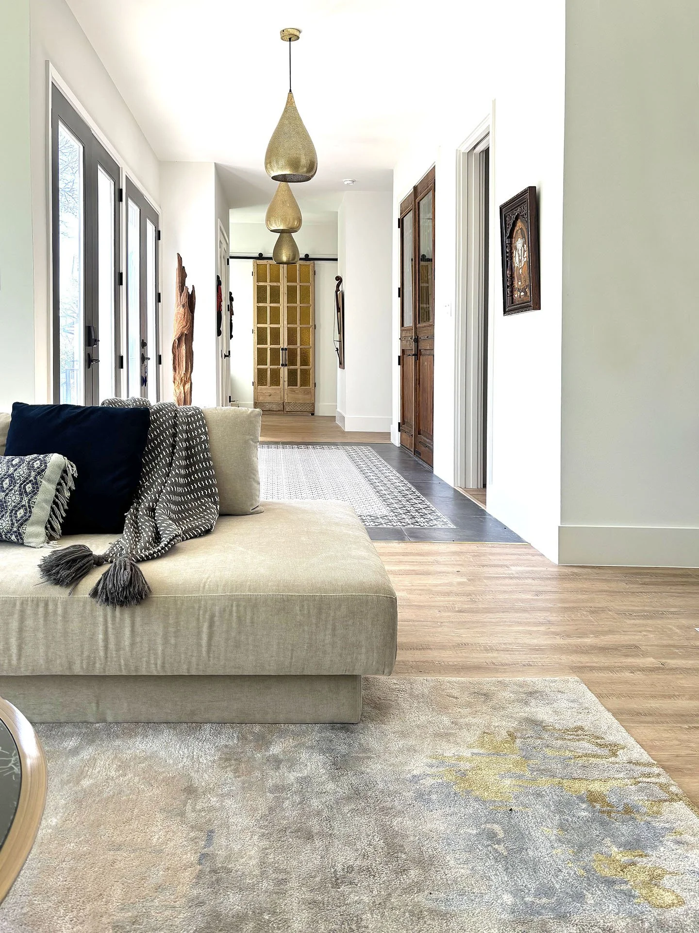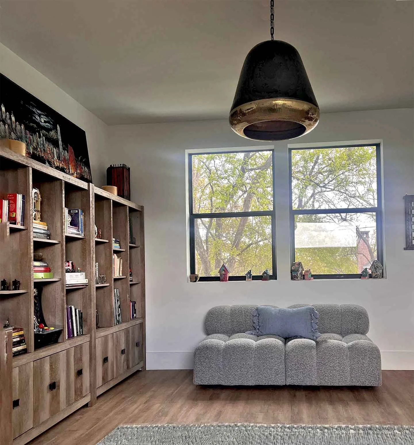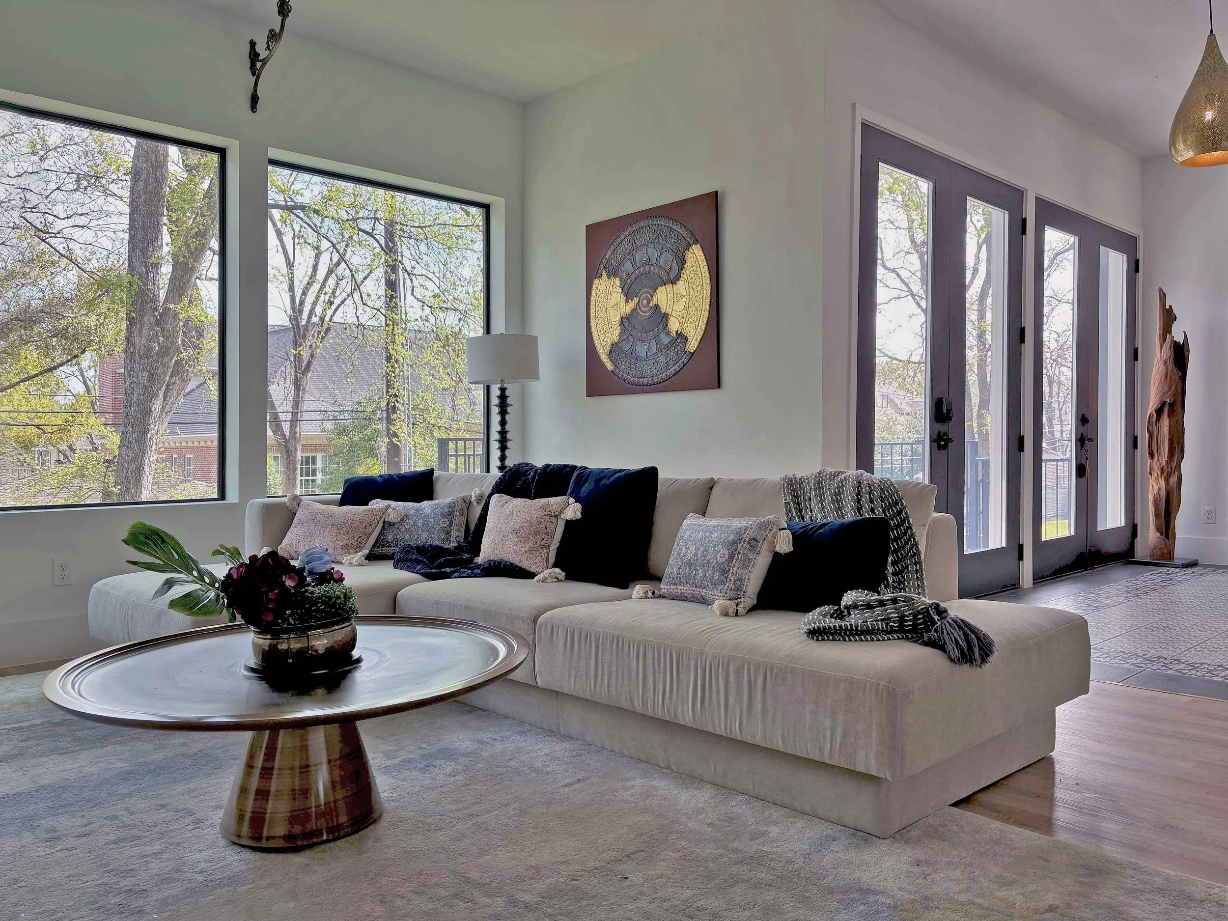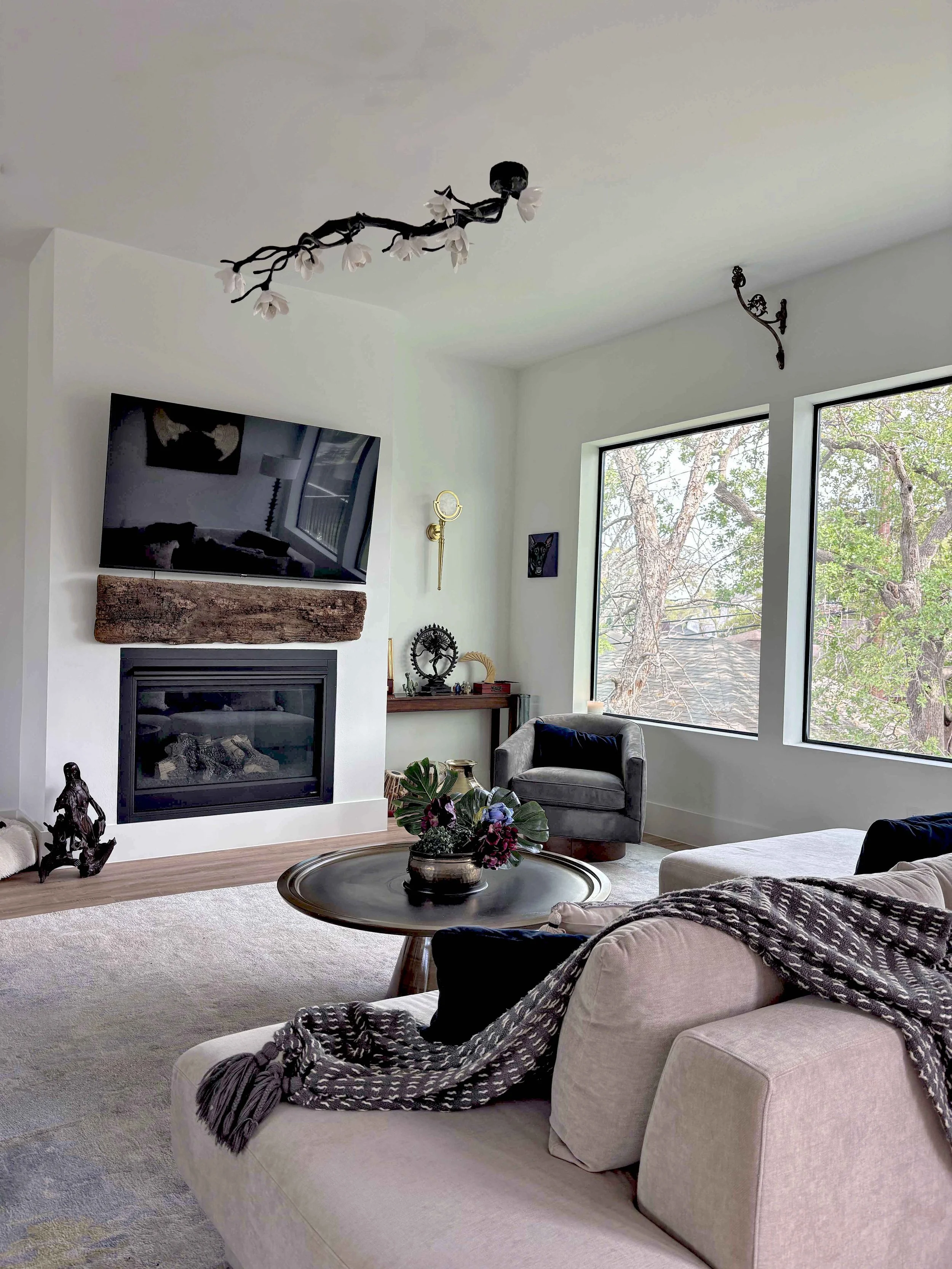 A view of the Living Area flooded with natural light. A set of antique corbels contrast the modern finishes in this home and lend it a sense of time and place.