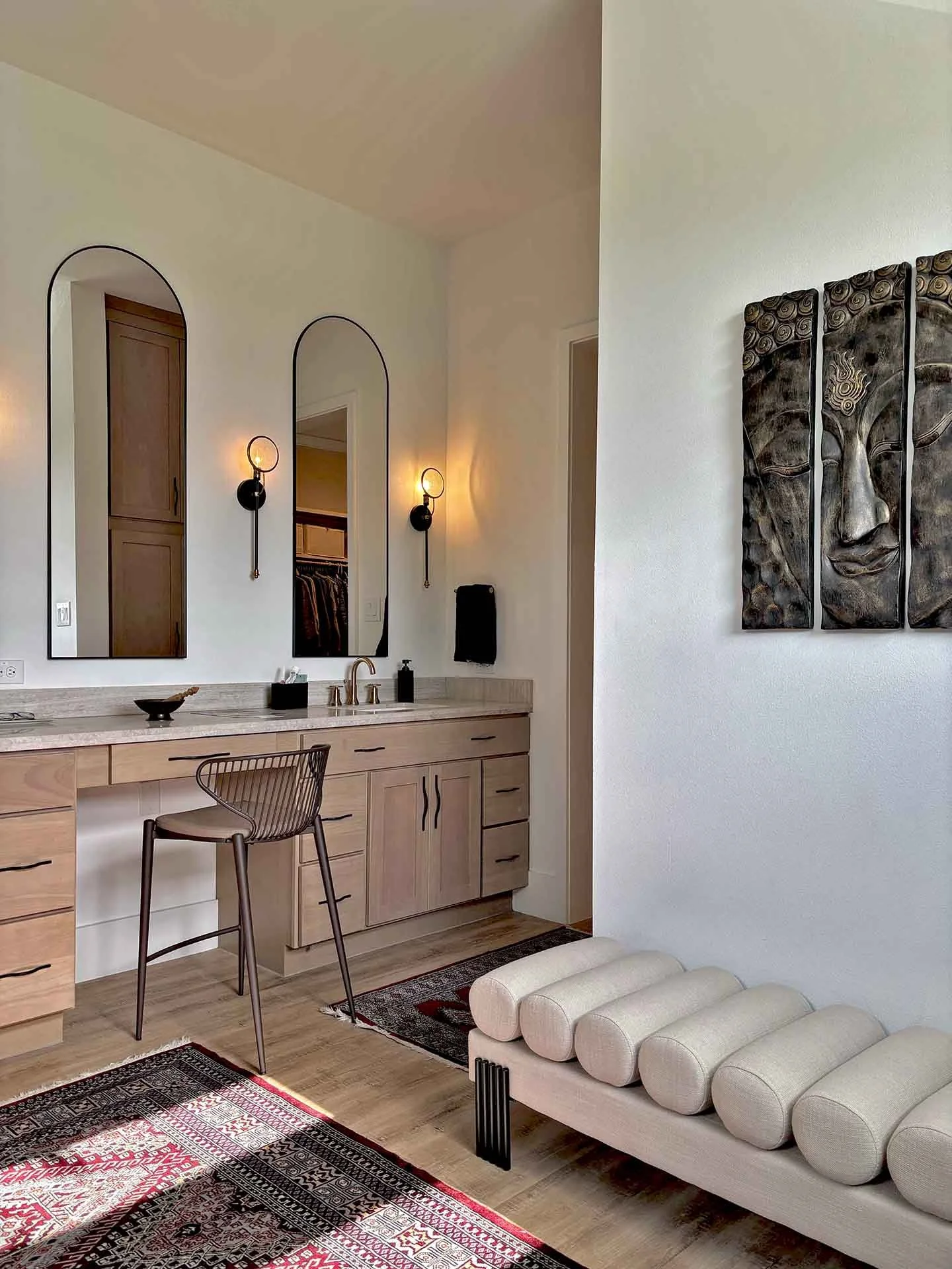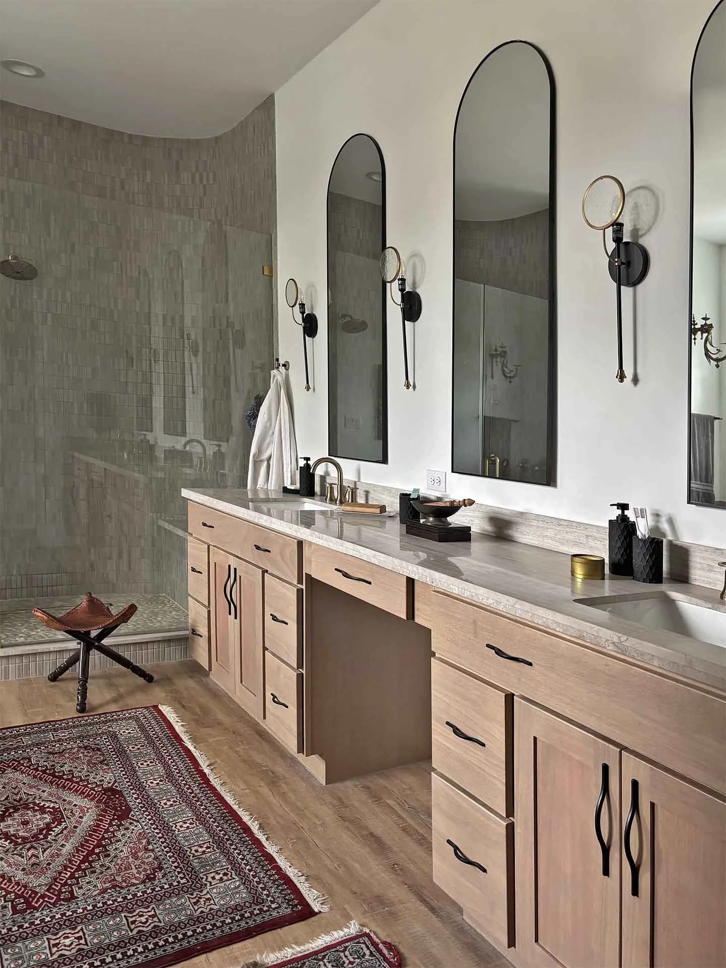The Primary Bathroom features a custom-designed oversized double vanity and makeup space, with three oversized arched mirrors. Unique oversized sconces provide interesting ambient lighting. A view of the curved shower is in the back.