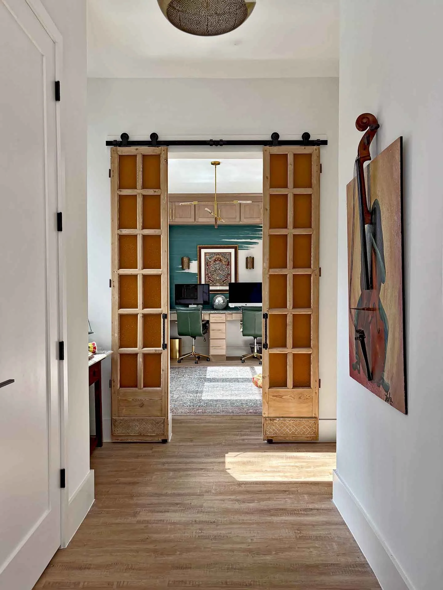 The antique doors to the Study from India feature amber glass panes to provide both beauty and privacy.