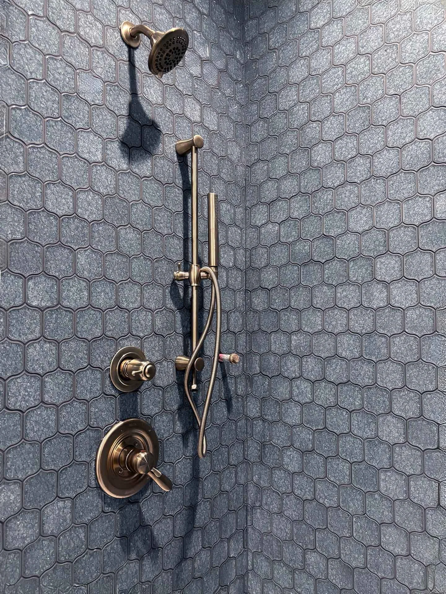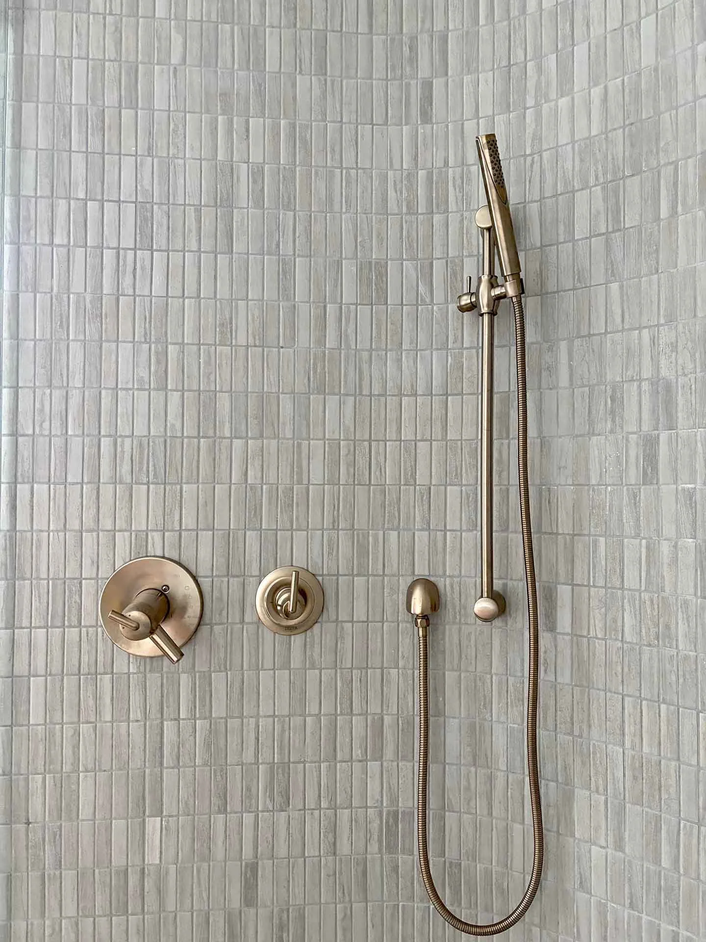 A close up showing the shower trim, the pink ledge and the special thick and thin grout pattern used here.