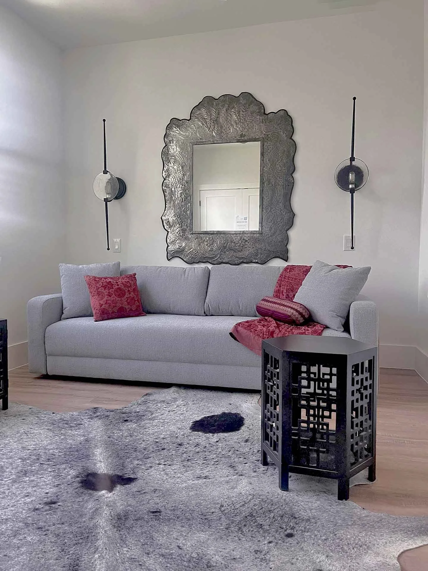 The Guest Room/Workout Space features an uber-comfortable sofa bed, sconces and two easy-to-move end tables. When guests are not in town, this area turns into the family's yoga, weight and dance studio!