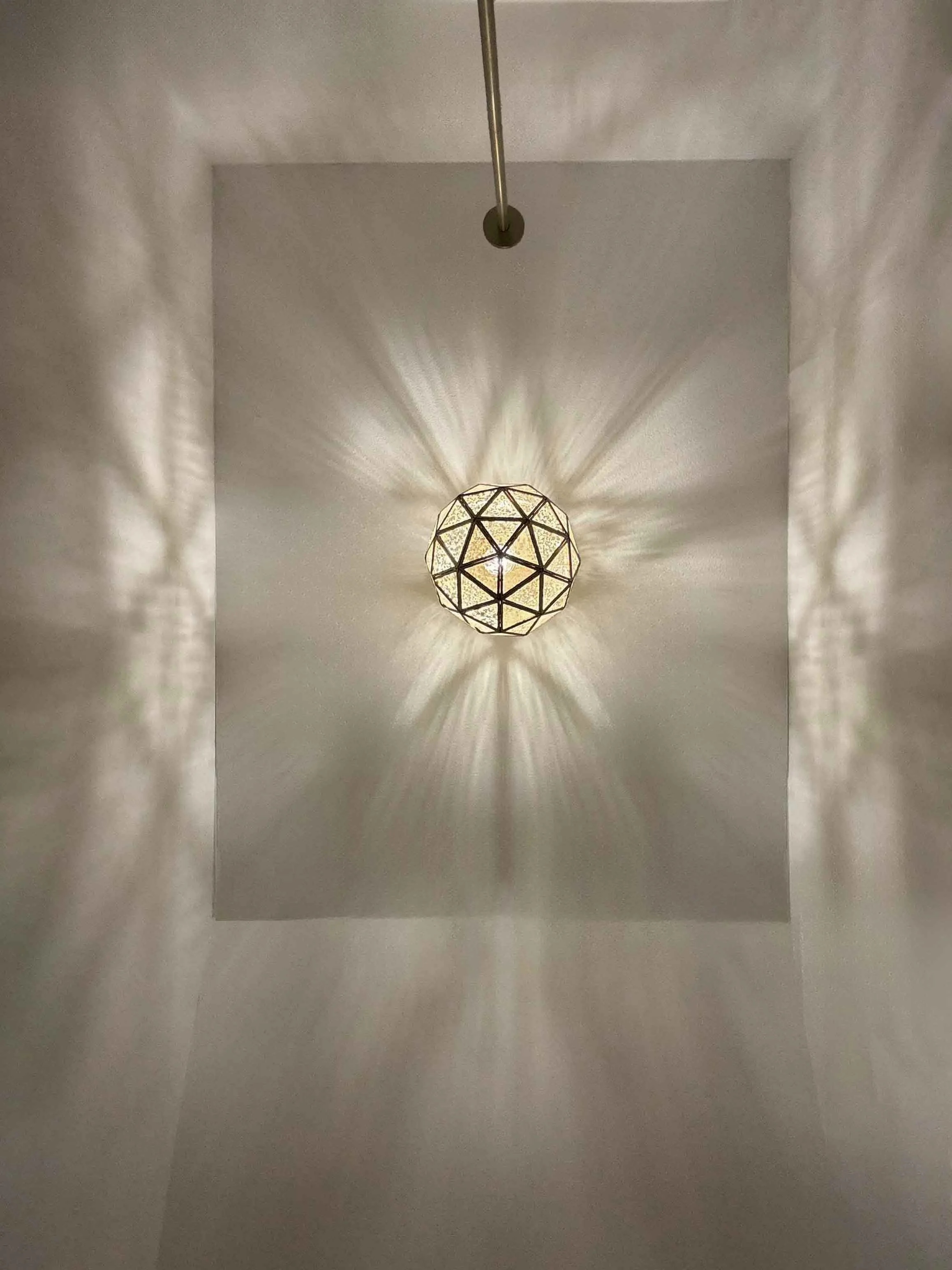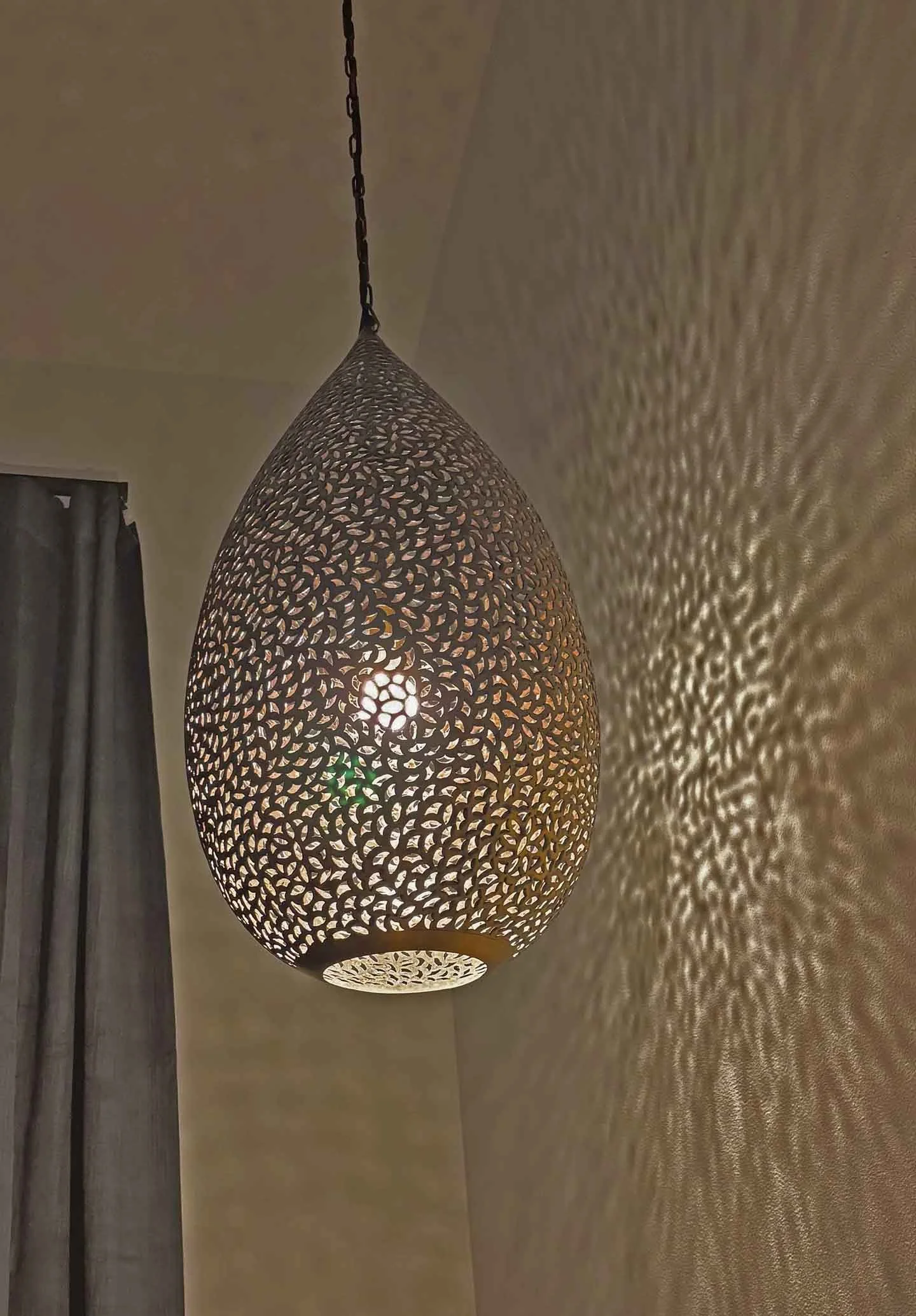 The pierced brass pendants give delightful lighting effects on the walls when turned on.