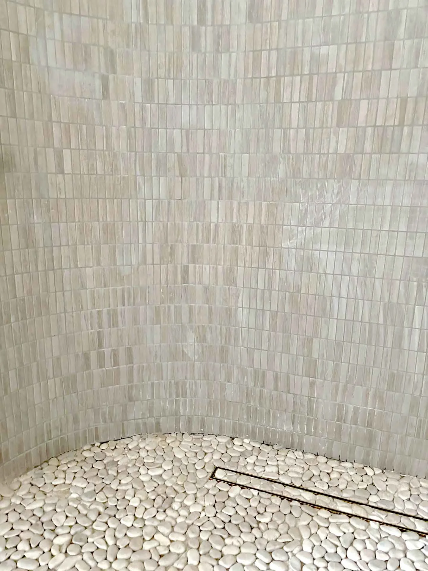 The oversized shower features a curved design, with a long linear drain and a bench.