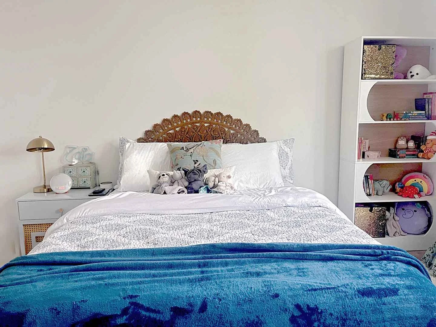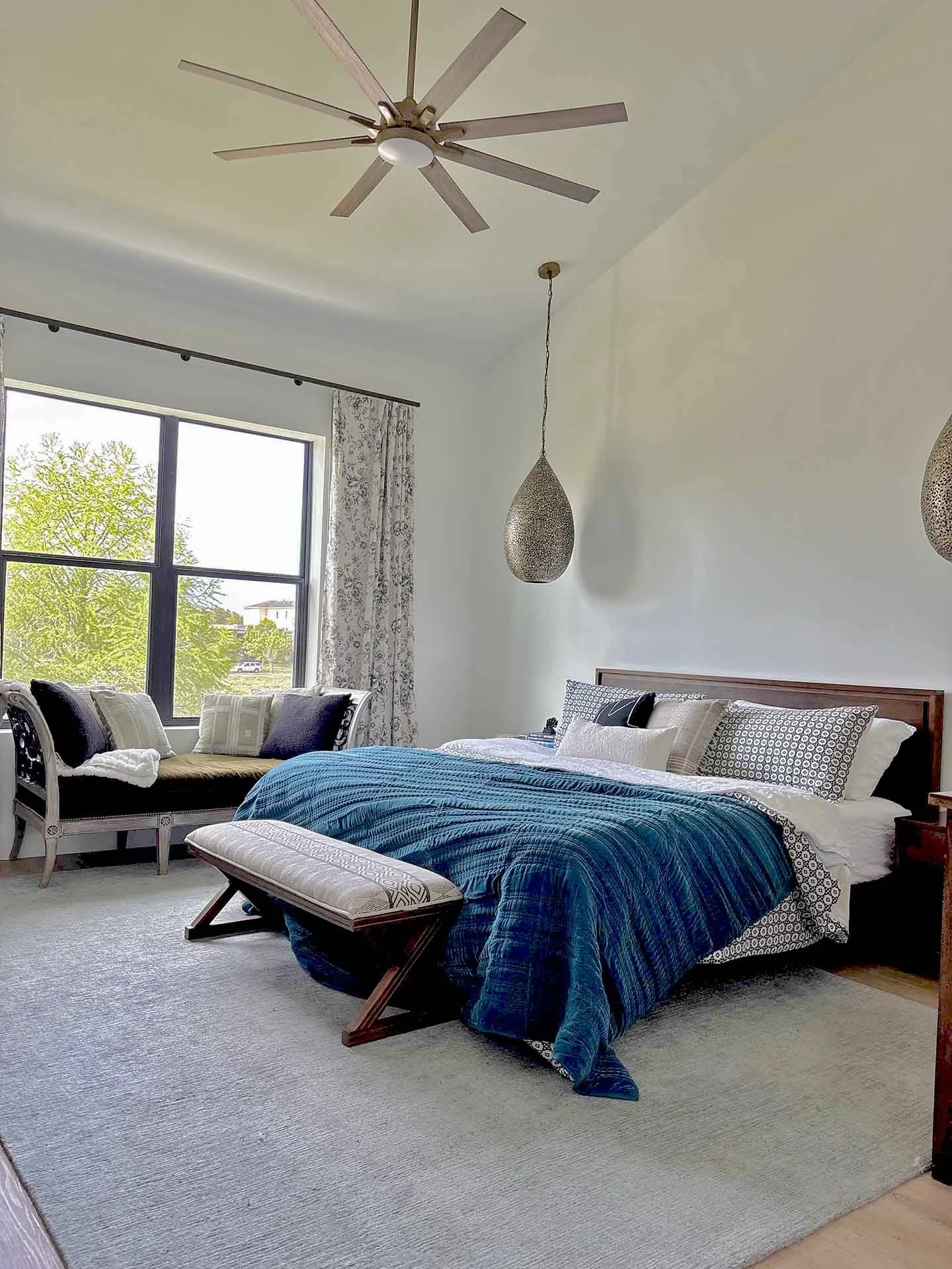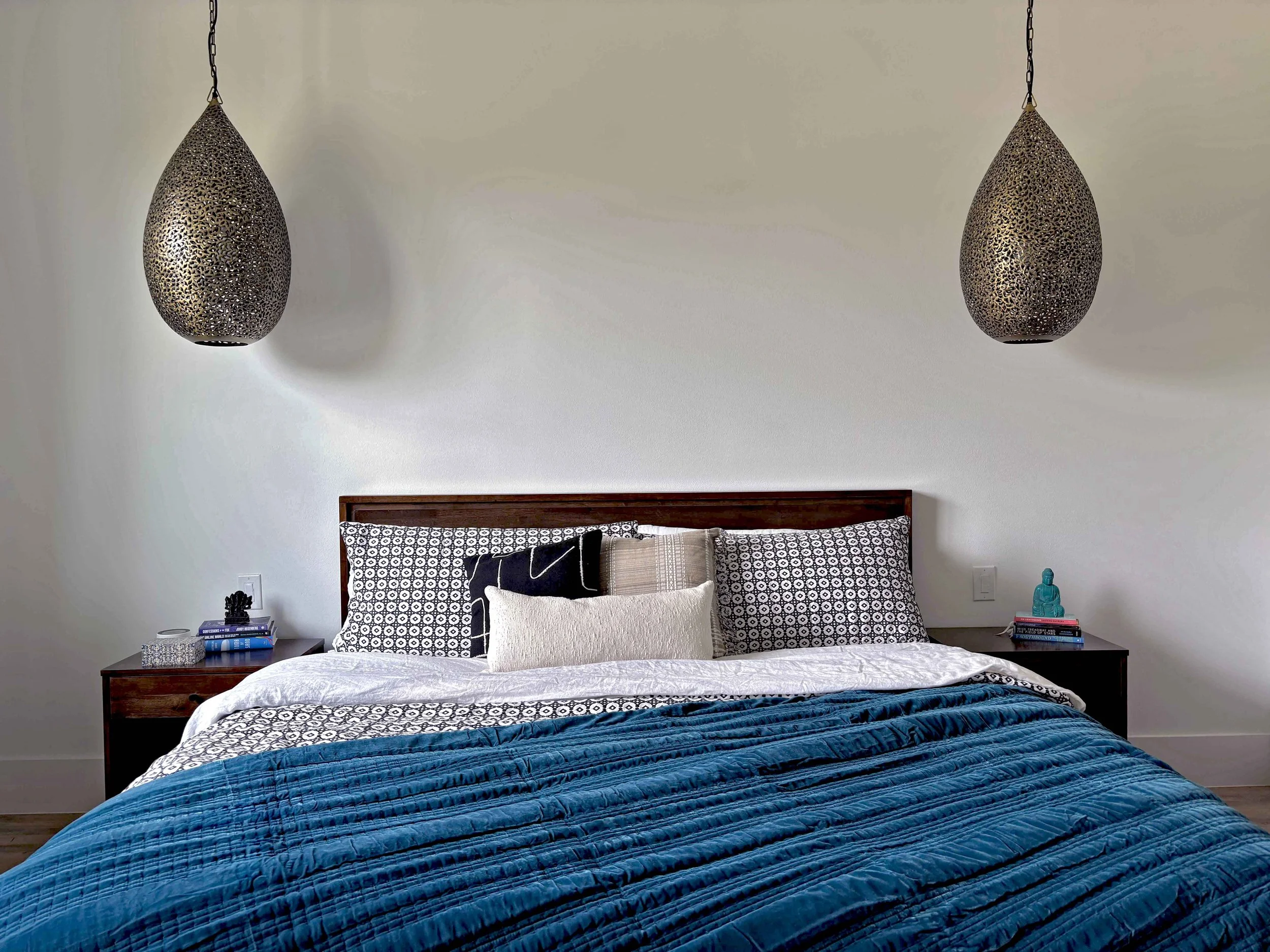 Large brass pendants take the place of bedside lamps, allowing for simple styling for these avid readers.
