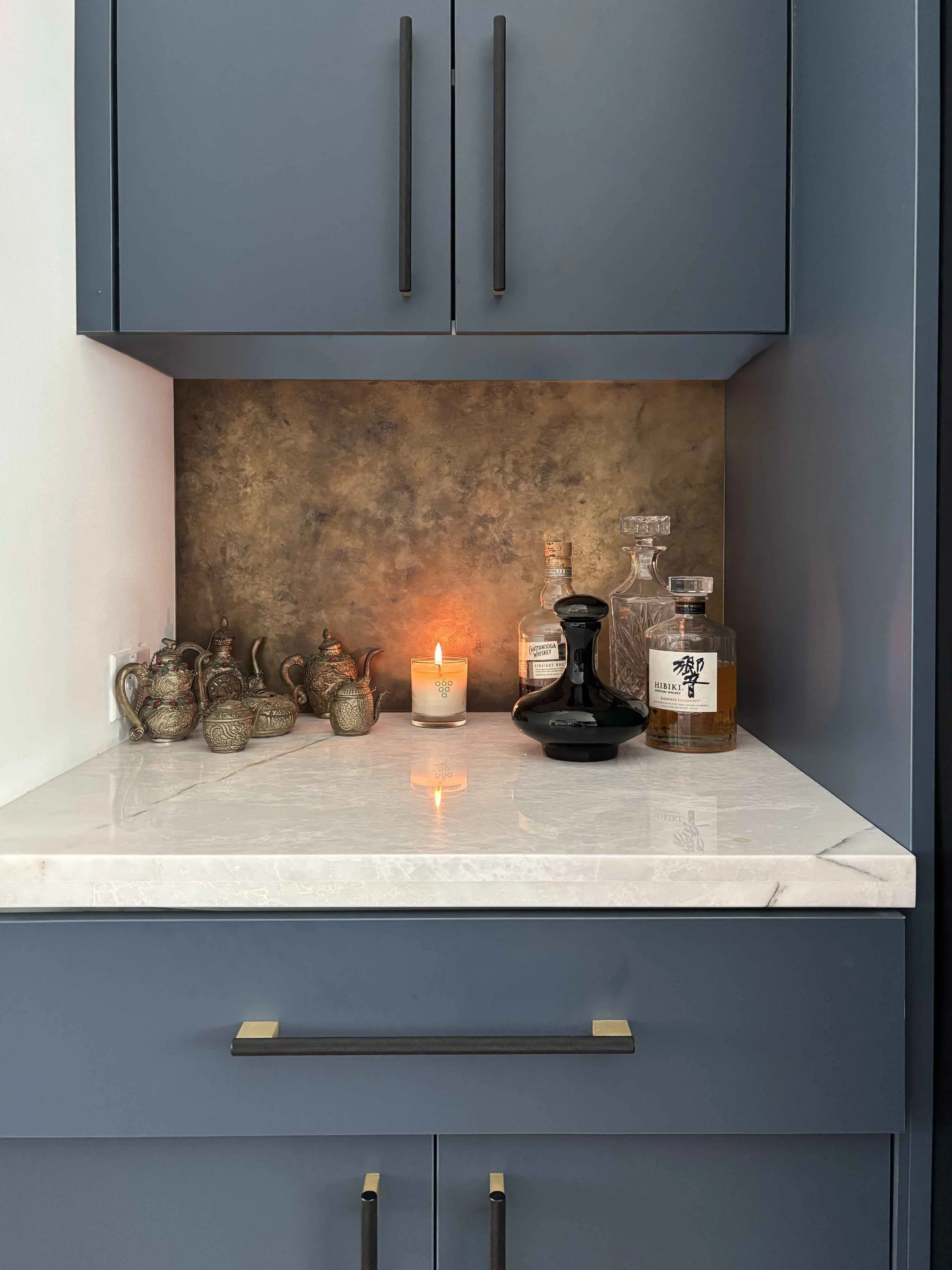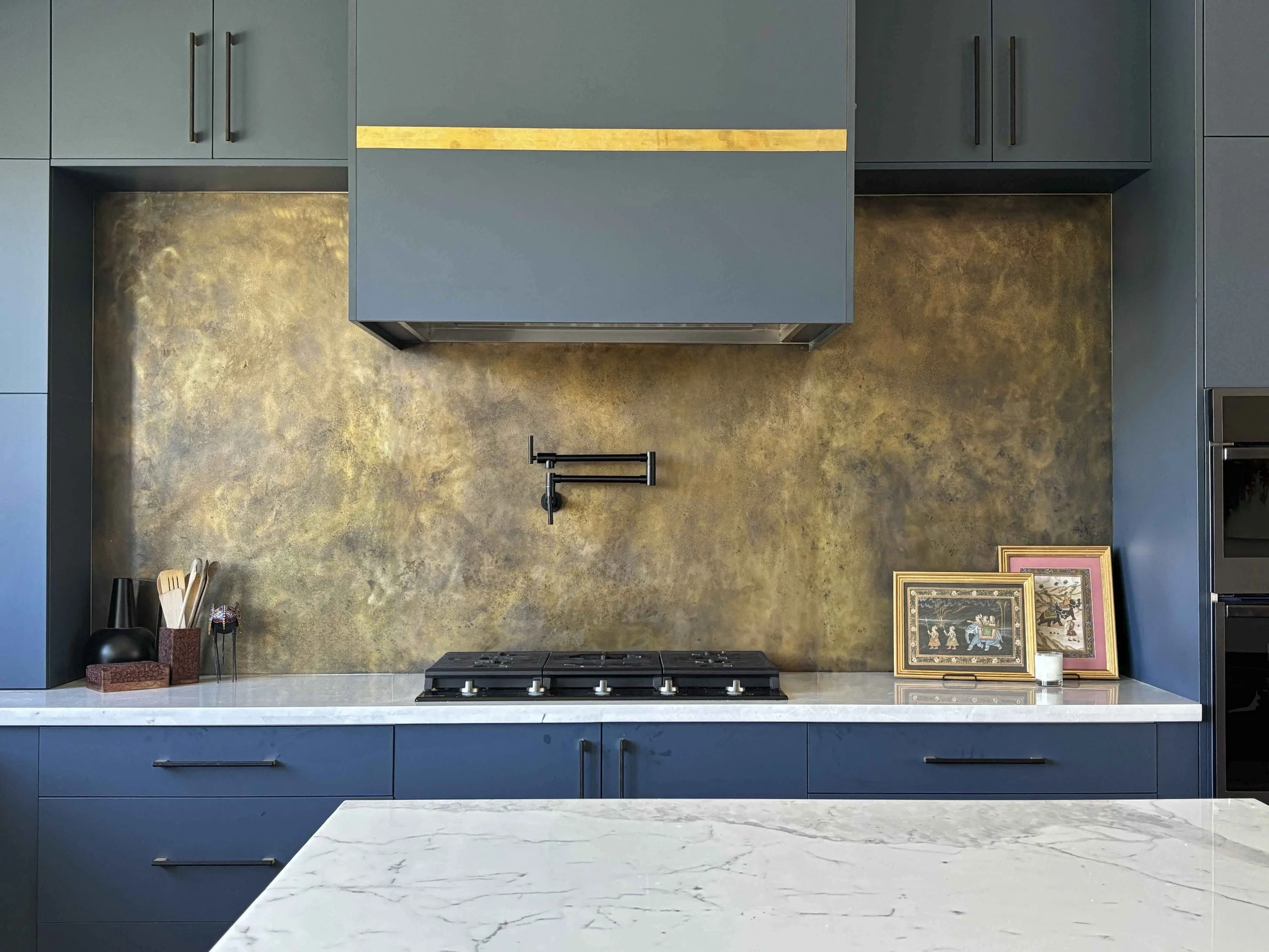 A view of the brass-clad backsplash in the Bar area in the Kitchen.