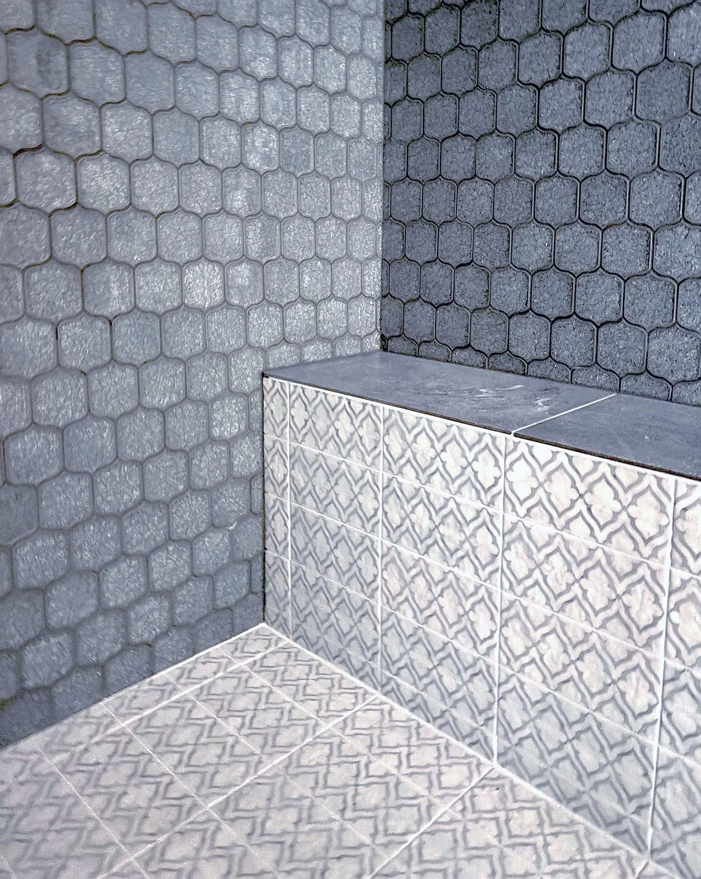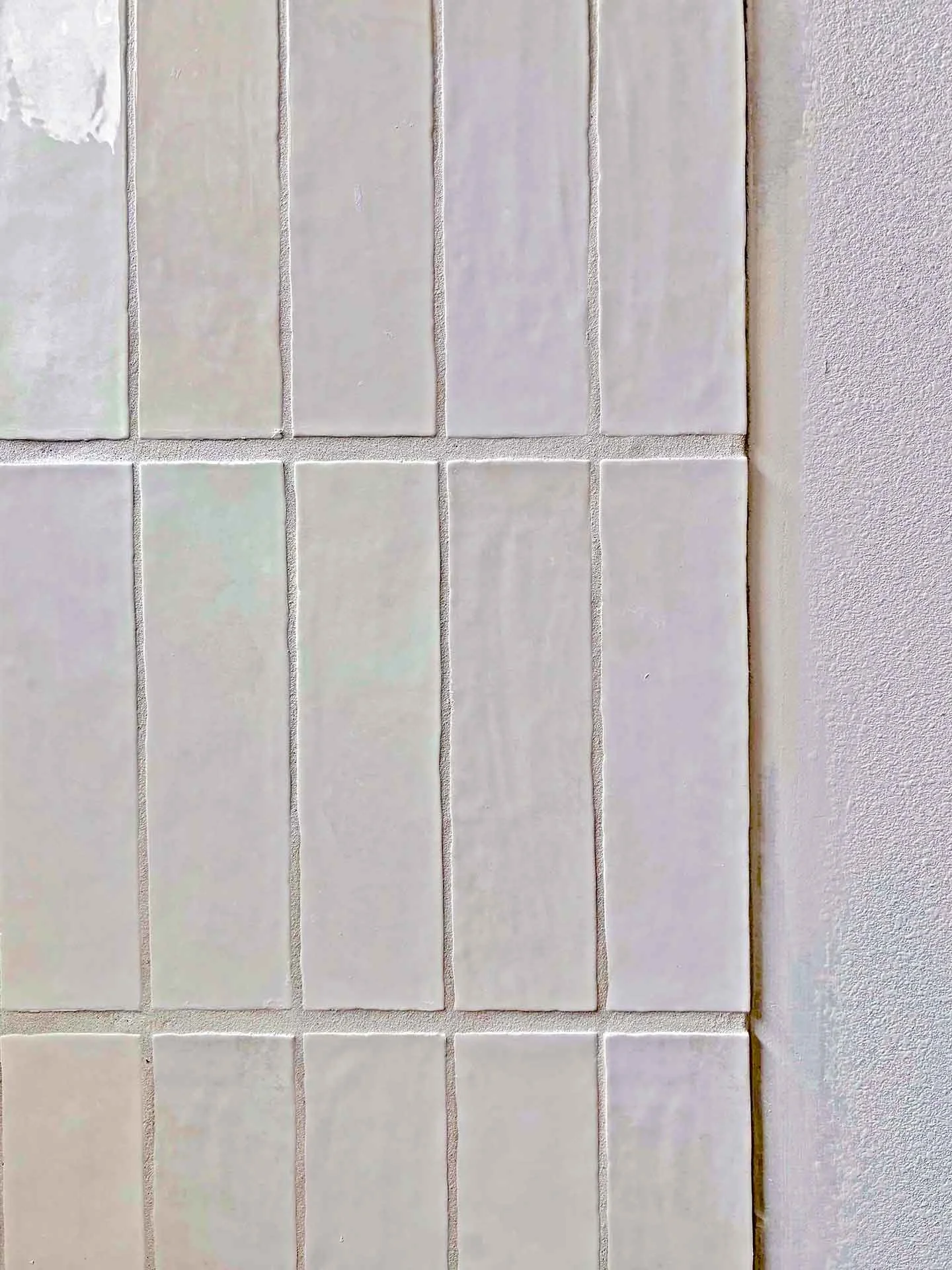 A close up showing the variation in the tile and the thick horizontal grout line paired with the thin vertical grout line.
