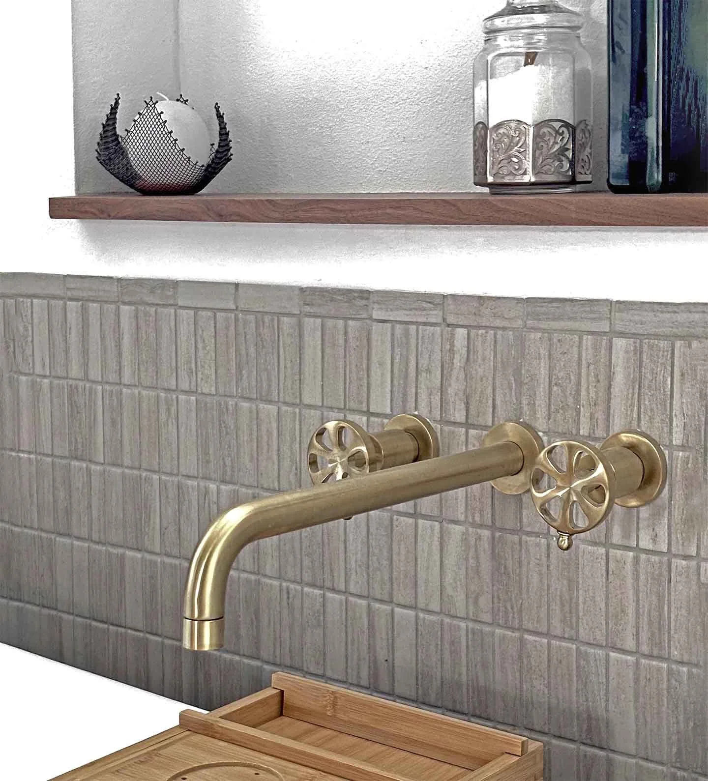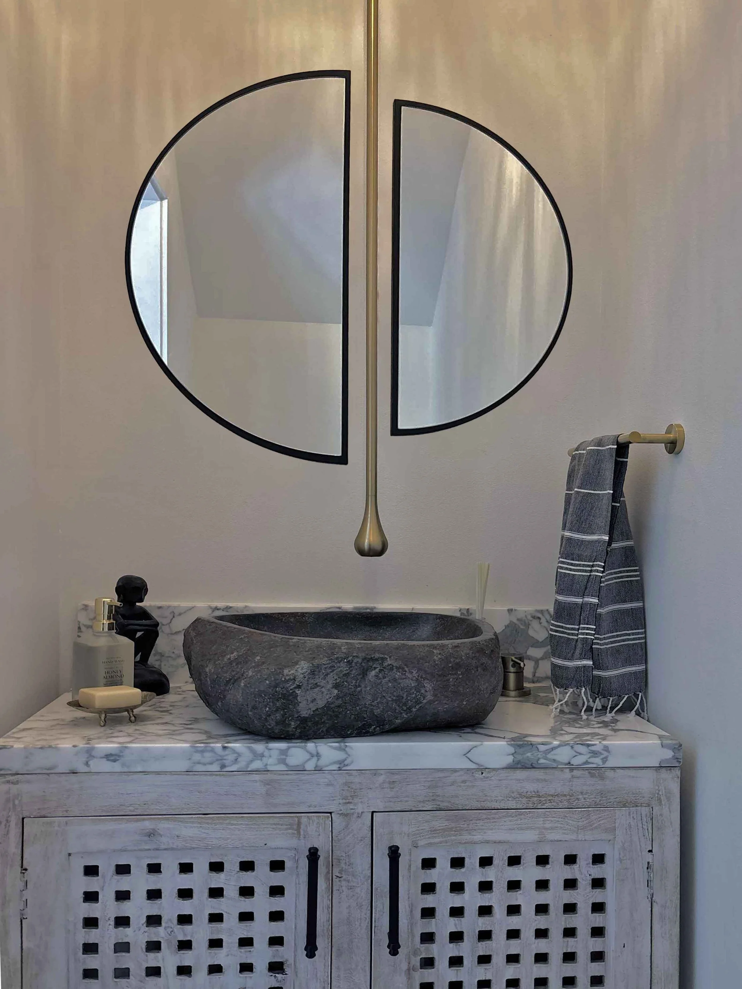 The Powder Room features a custom driftwood vanity with Arabescato marble and a natural river stone sink. Two custom demilune mirrors in different sizes make an unexpected vanity mirror and are interrupted by a faucet originating from the ceiling. Brass accessories complete the picture.