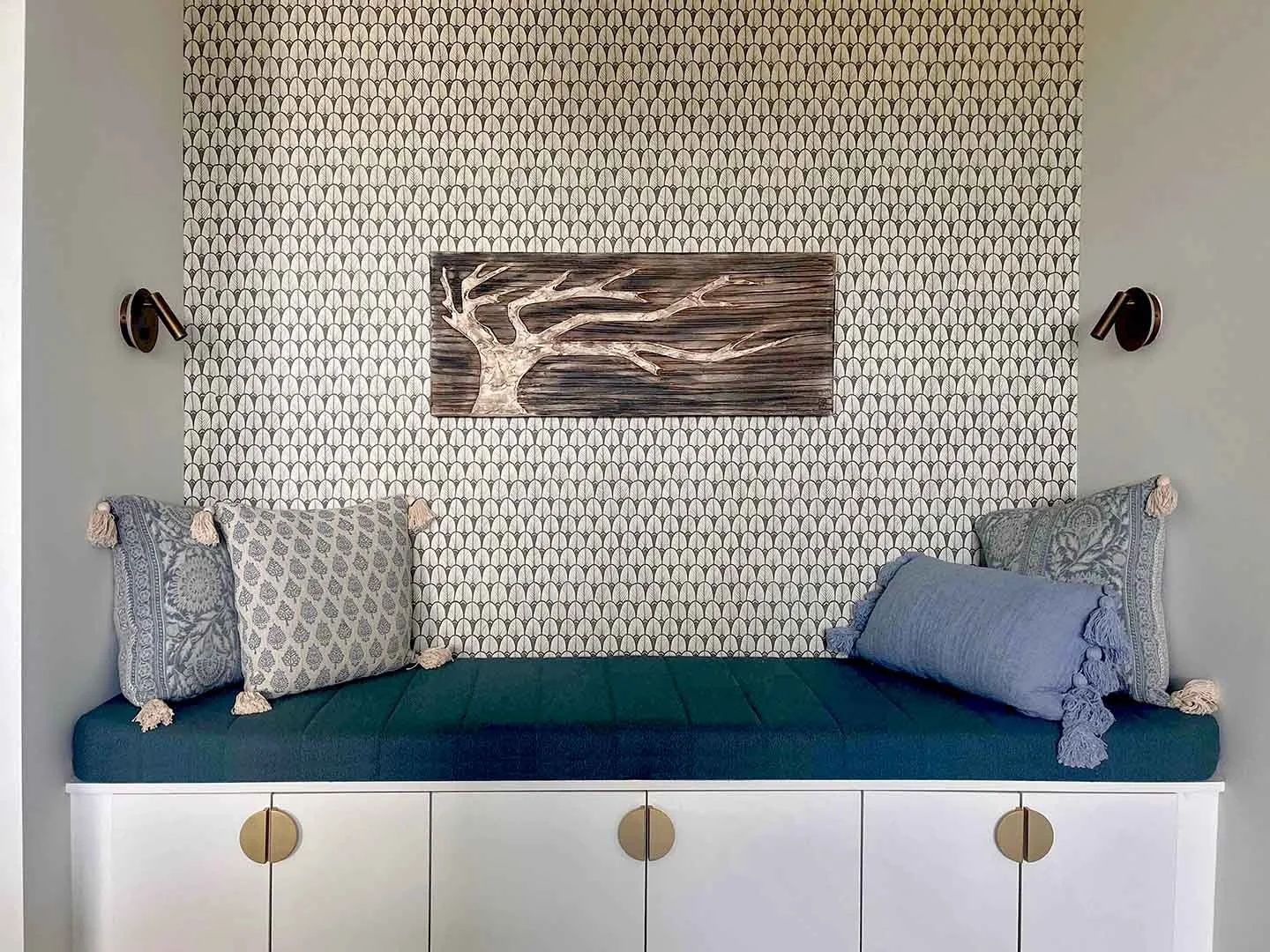 The reading nook at the top of the stairs feature a comfortable bench, plenty of storage underneath, and reading sconces that offer multiple lights and can be adjusted to any angle. The wallpaper and artwork bring the 'pretty'.