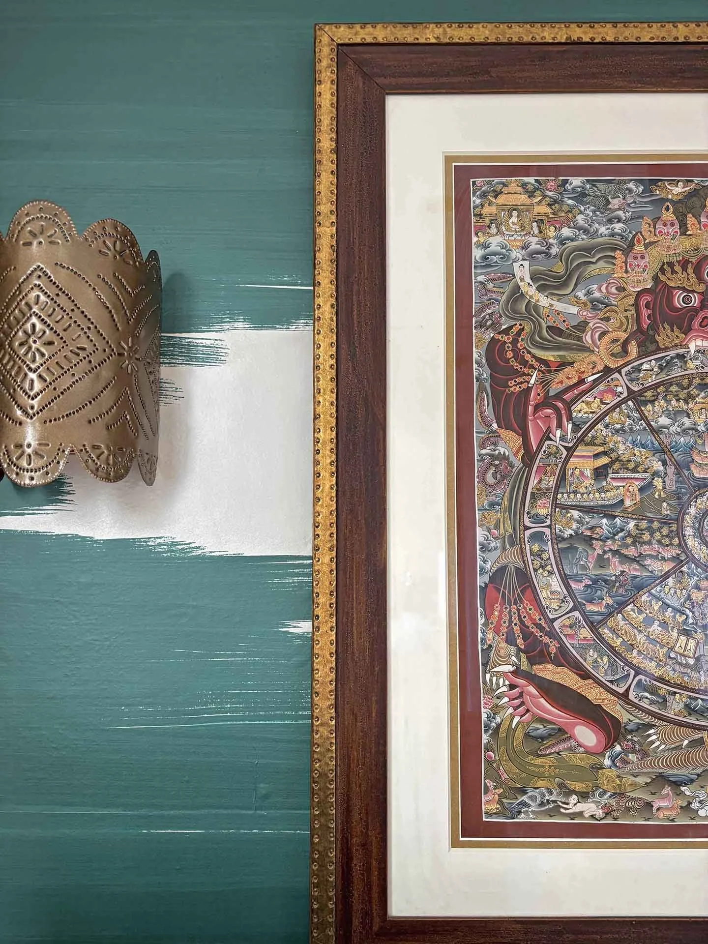 An artistic look at the wall treatment, sconces and artwork from Kathmandu.