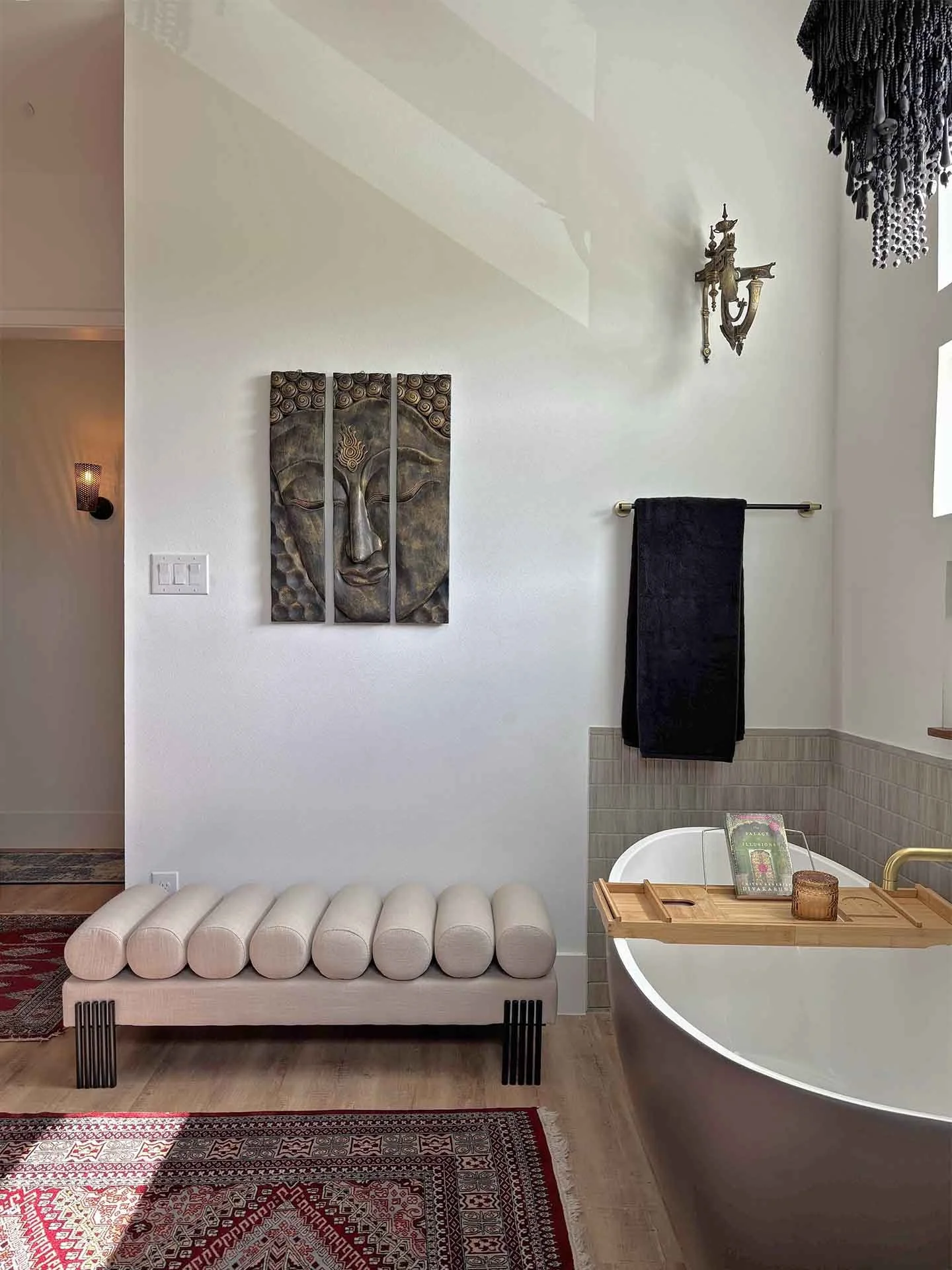 The grand soaking tub is set against the windows, a space that offers a luxurious nook for bathing. An over-the-top beaded chandelier provides mood lighting, while two antique corbels frame the space.