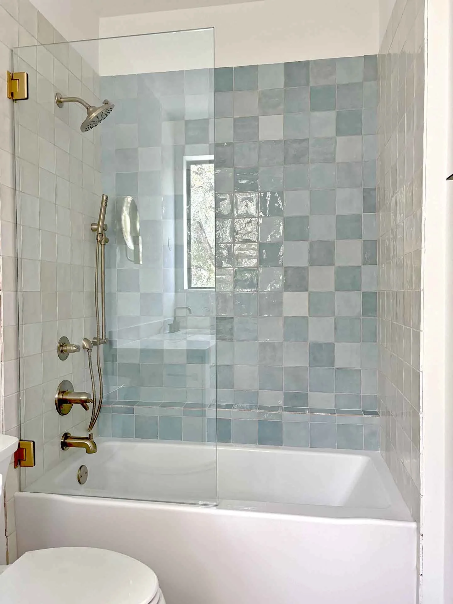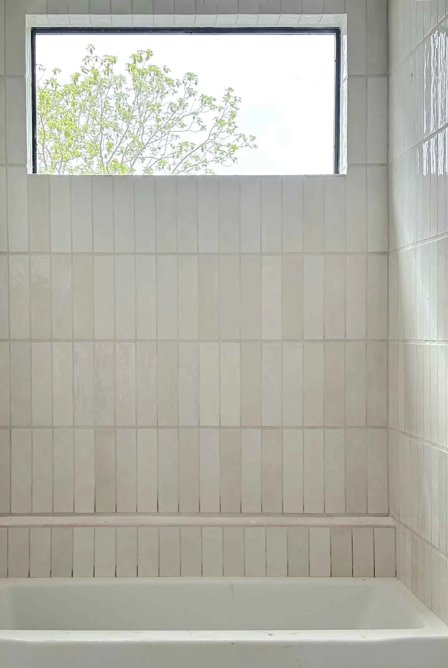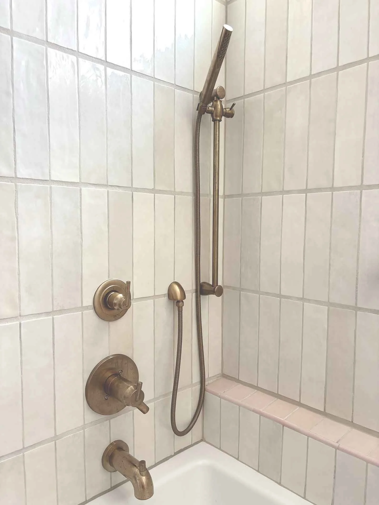 The shower area features a pink ledge to hold bath products and rectangular zellige tile in the palest blush/sand color.