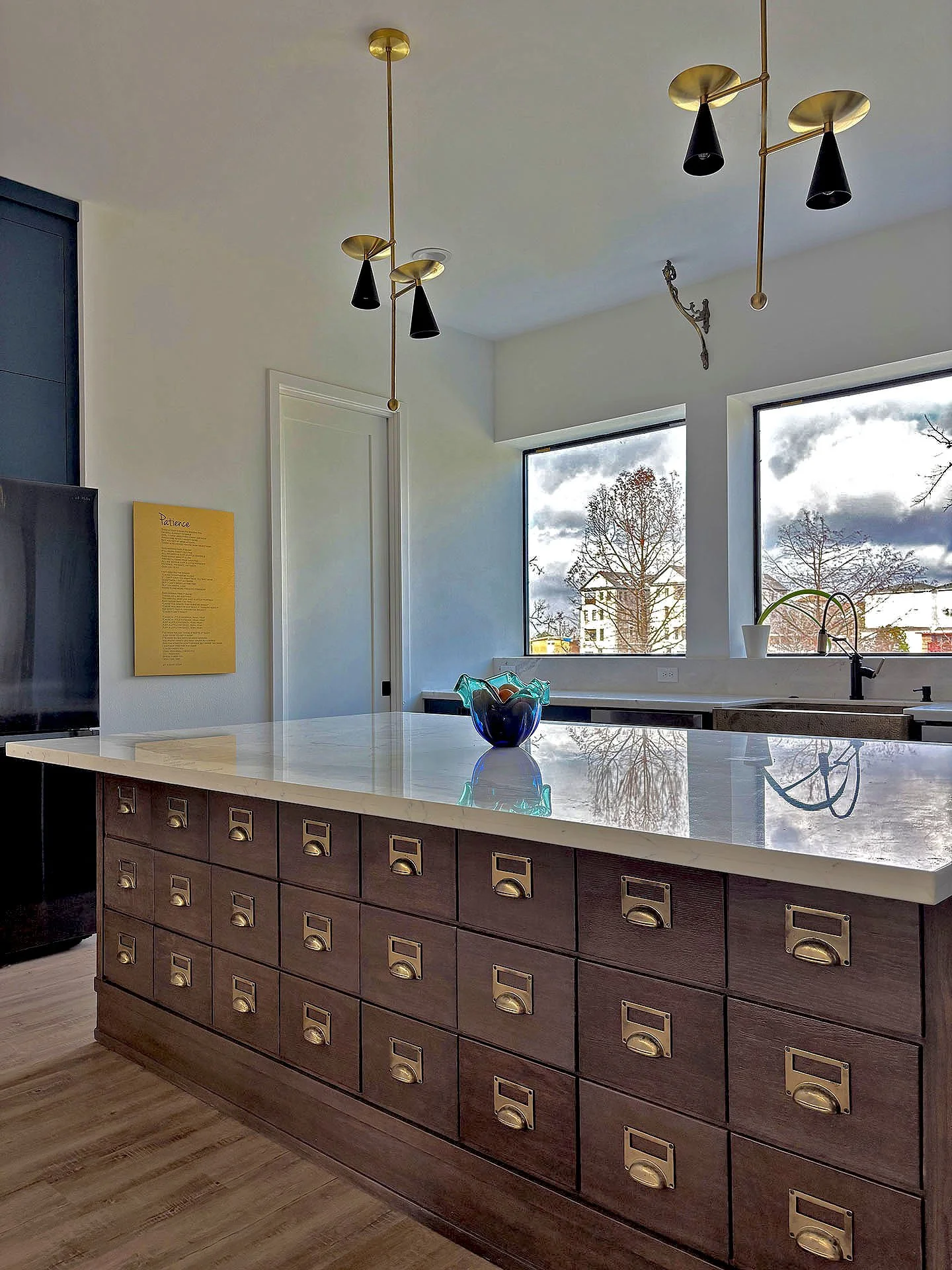 An early picture of the antique Dutch apothecary cabinet (c. 18th century) that Tash went on a 1-year hunt for to build this kitchen island. This piece was refinished to protect the stain, and fortified on the ends for durability, but otherwise remains in its original glory. The 24 drawers are all in use - and fabulously practical! Behind it, Tash designed a set of modern kitchen cabinets facing the kitchen sink and windows to create a kitchen island that is 98" x 48".