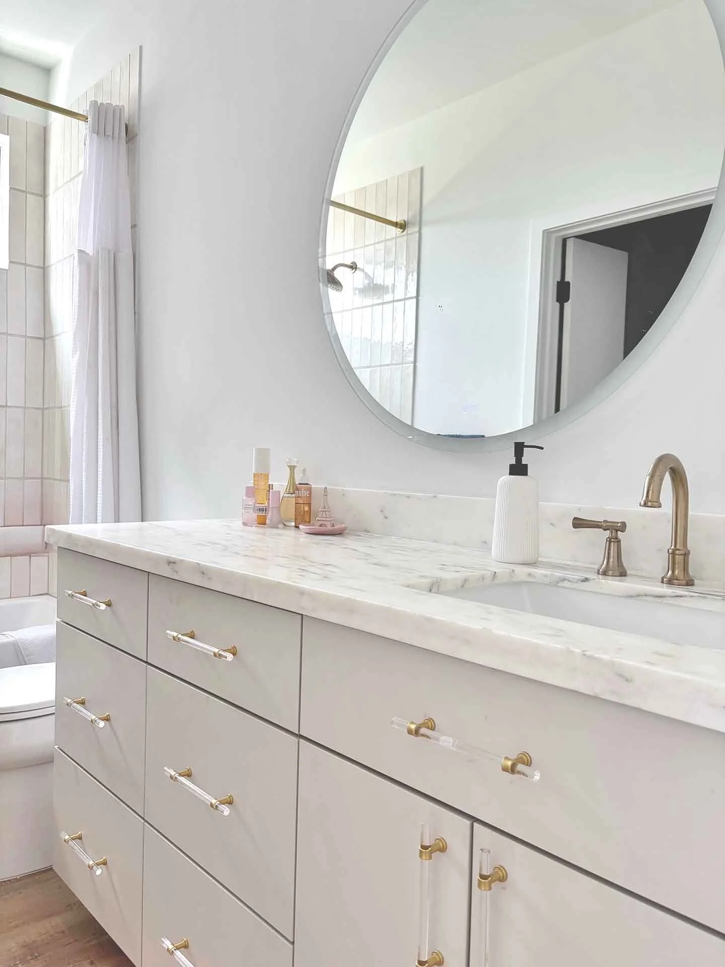 A teen's bathroom with plenty of counter space to get ready, lots of drawers for make up and a light up mirror.