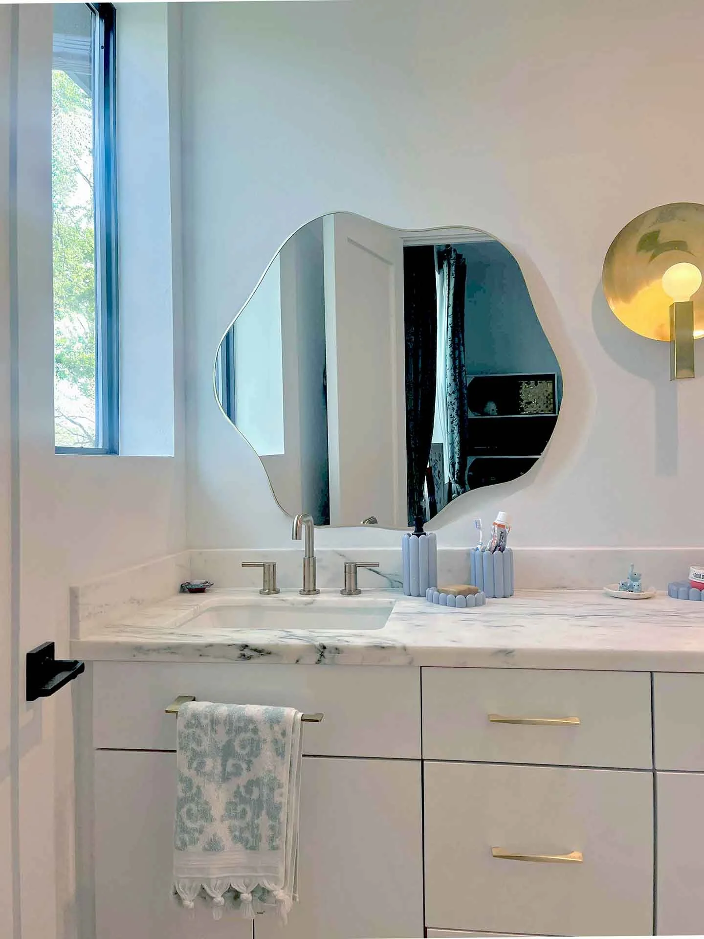 A child's en suite bathroom with an asymmetrical cloud mirror, sconce and accessories for a child who loves the ocean.