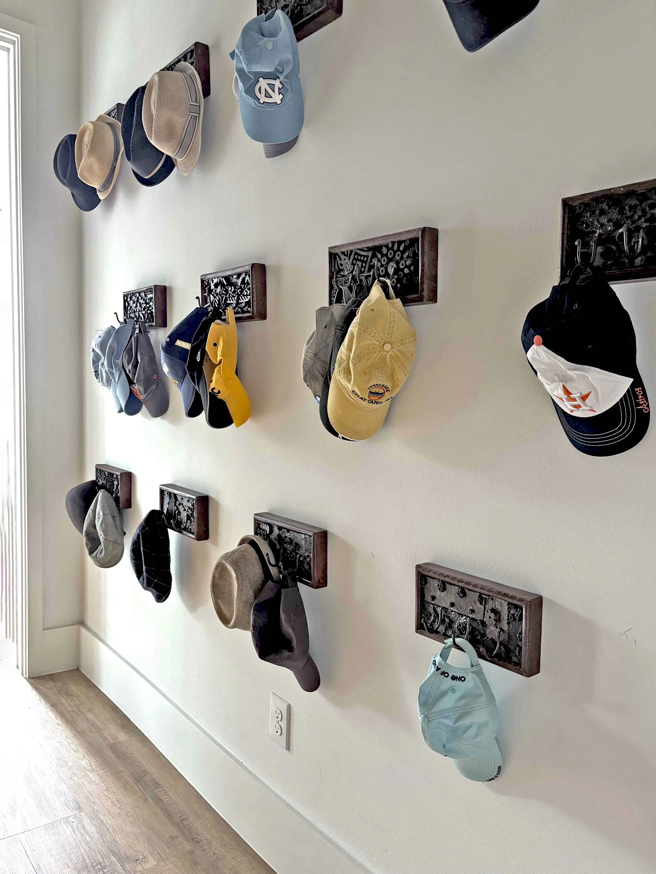 The opposite wall of the Mudroom is a 'Hat Wall' - a feature this family REALLY needed for how many hats they own! Not even a third of their hats are shown here. There are 50 hooks mounted onto vintage carved wood plaques with a carved Garuda from the couple's travels to Bali overseeing it all.