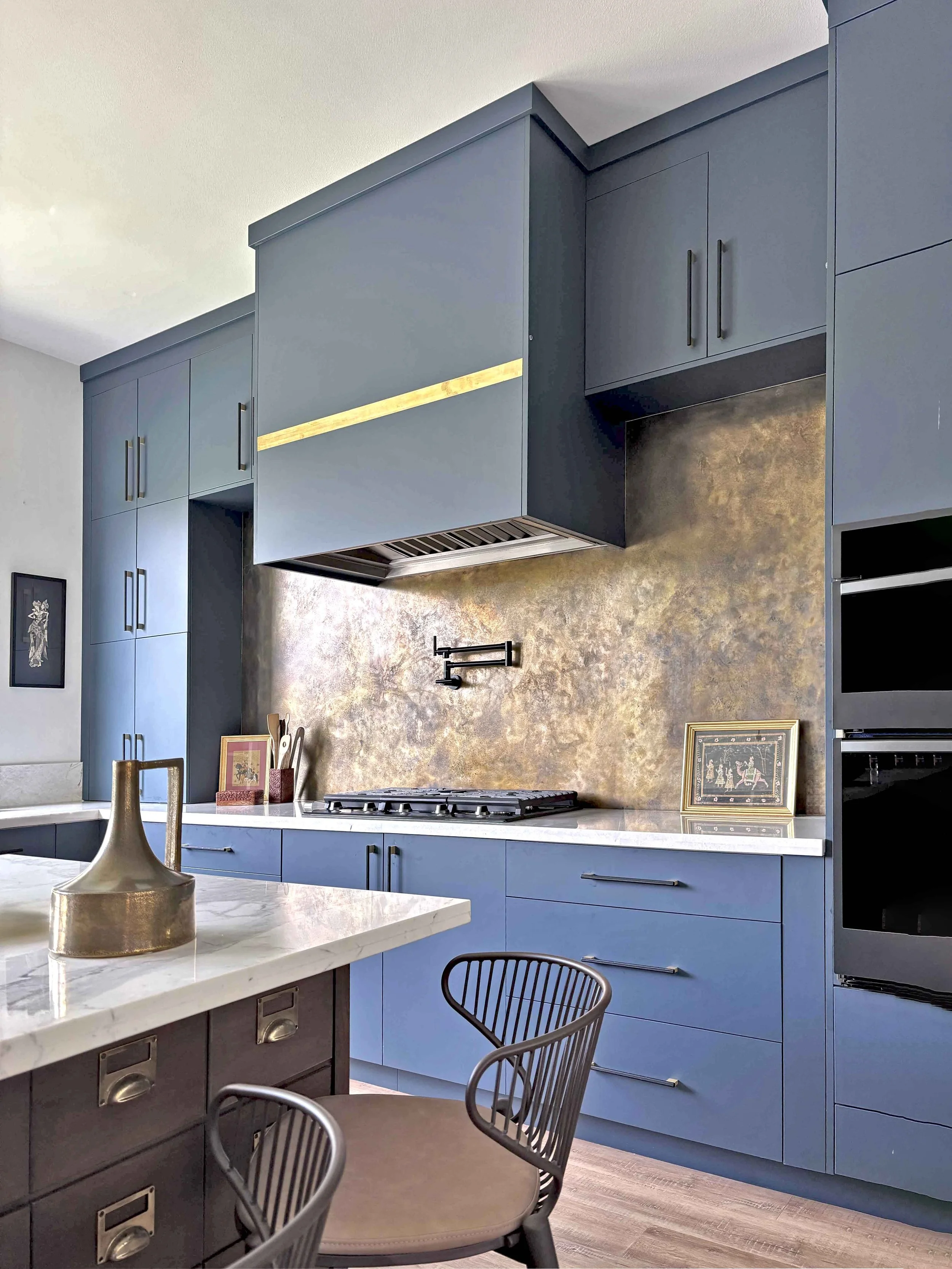 The backsplash to end all backsplashes - this is real brass with a patina to give it movement and depth behind a custom range hood. Tash is a big believer in art in the Kitchen, so these paintings are not just 'styled' for the photograph - they genuinely sit on the countertop permanently and bring joy.